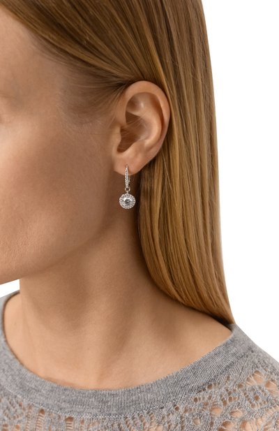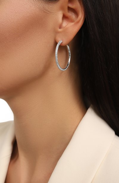 Незамкнутые серьги-кольца Sublima с застежками-пусетами выполнили из полированного сплава с родиевым покрытием. Внутреннюю сторону аксессуара декорировали прозрачными кристаллами в форме шипов.