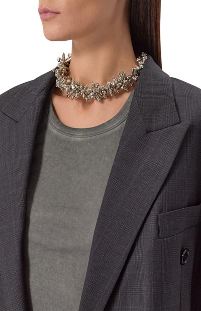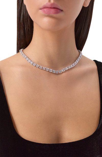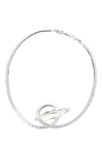 Колье Matrix выполнили из лату ни с гальваническим покрытием родием. Украшение декорировали мелкими кристаллами багетной огранки и крупным кристаллом огранки «маркиз».