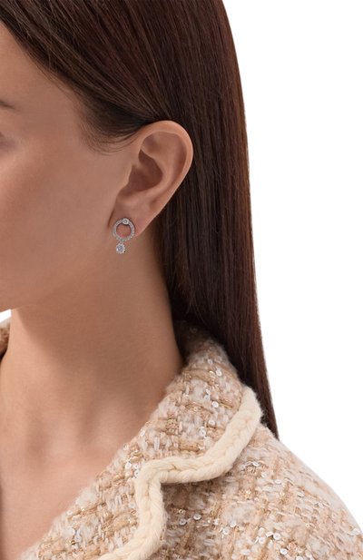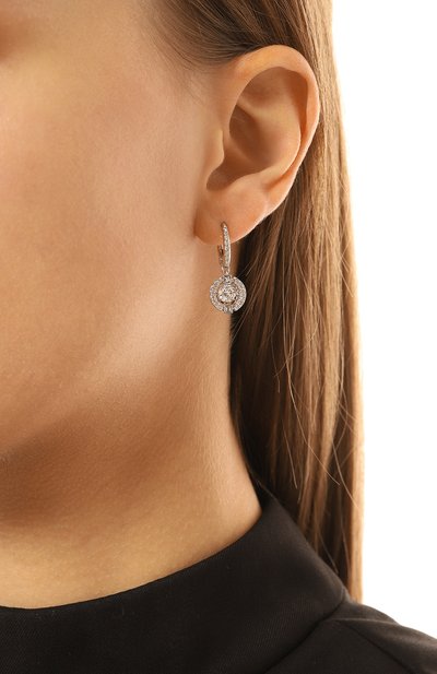 Серьги Una Angelic с подвеской на цепочке выполнили из латуни с гальваническим покрытием родием. Основание и сферический шарм украсили кристаллами круглой огранки. Нижнюю деталь дополнили отверстием, поэтому ее можно застегнуть с задней стороны пусеты.