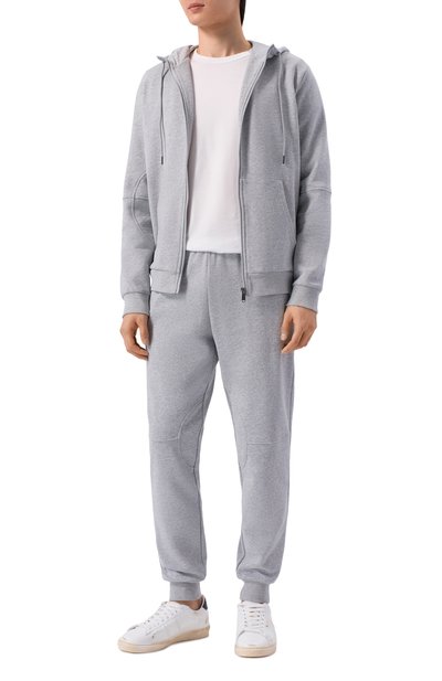 Для создания костюма из линии Core Lady использовали хлопковый трикотаж. Толстовку с капюшоном, как и прямые брюки, дополнили двумя карманами. Оба изделия украсили металлическим логотипом EA7.