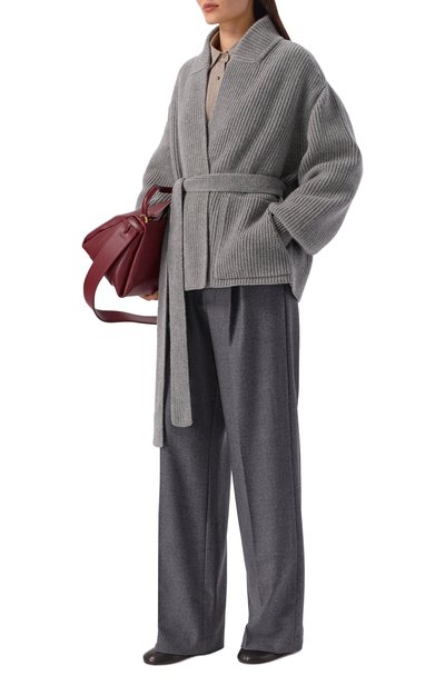 Кардиган Gemma связали английской резинкой из кашемировой пряжи, изготовленной из восьми нитей двойного кручения. Модель с двумя накладными карманами фиксируется широким съемным поясом-лентой.