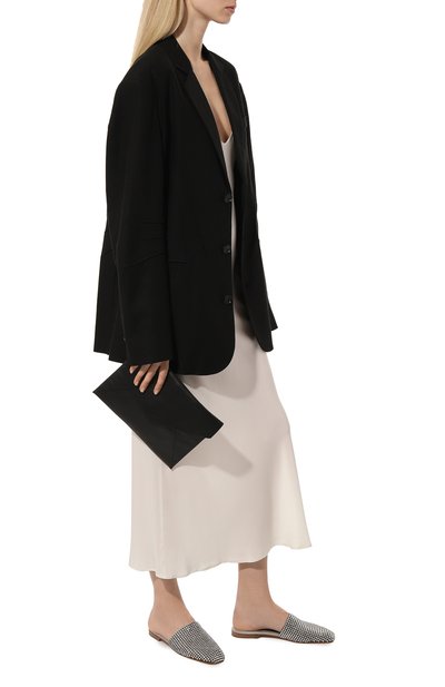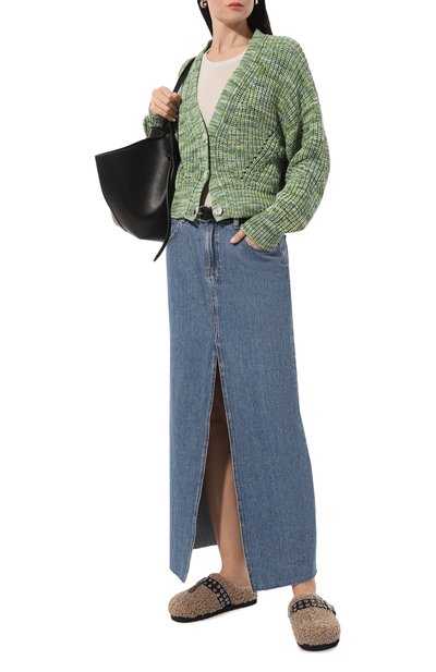 Сабо из покрытой стразами козьей замши утеплили овчиной ягненка. Верх установили на тонкую подошву, для создания которой использовали кожу и резину.