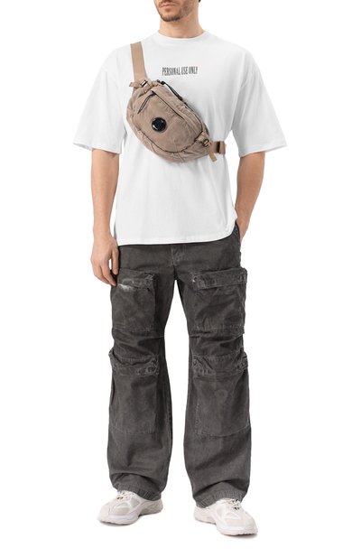 Футболку с неглубокой круглой горловиной сшили из хлопкового джерси. Сзади модель с брендированным принтом на груди украсили тремя фирменными люверсами.