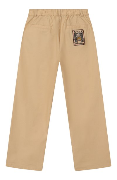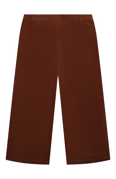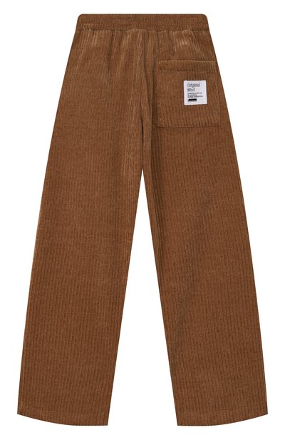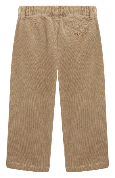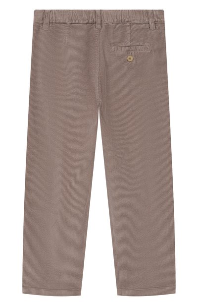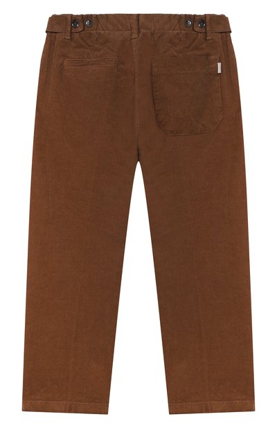 Брюки с двумя защипами и регулируемыми патами на эластичном поясе выполнили из хлопкового вельвета. Помимо двух боковых карманов на модели предусмотрели задние – врезной и накладной.