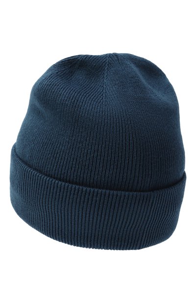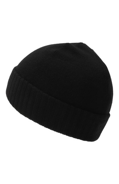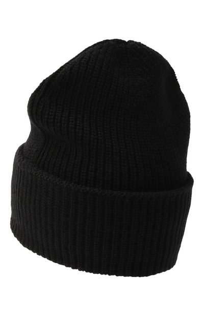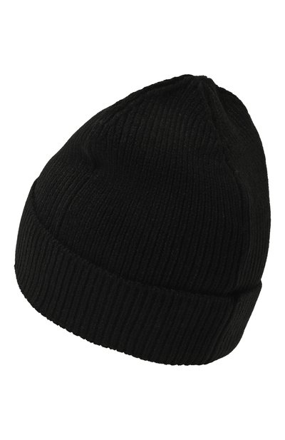 Шапку бини выполнили ребристой вязкой из пряжи на основе нейлона, шерсти и вискозы с добавлением кашемира. Широкий отворот дополнили брендированной нашивкой.