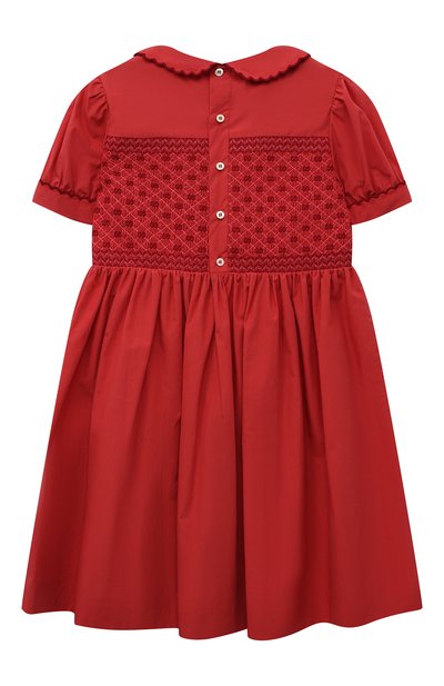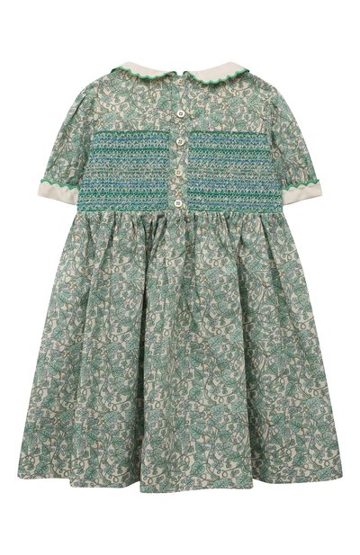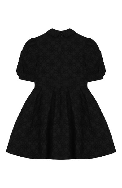 Платье выполнили из тафты с фирменным 3D-паттерном. Планку и клапаны карманов украсили брендированными пуговицами, а пояс — ажурной эмблемой. Модель с рукавами-фонариками и складками на подоле застегивается потайной молнией сзади.