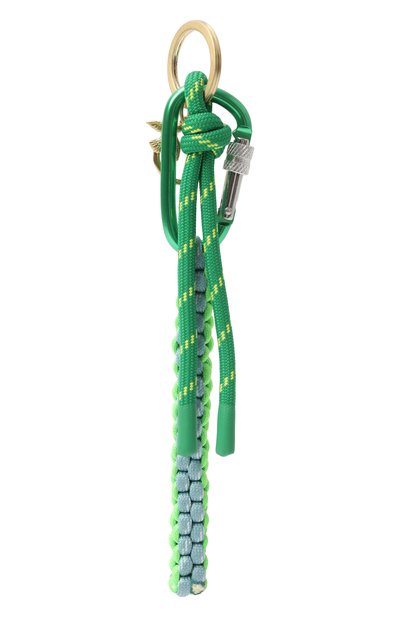 Брелок с карабином и разъемным кольцом сплели из хлопковых и кожаных шнуров. Аксессуар декорировали металлическими шармами с буквами, складывающимися в название марки.
