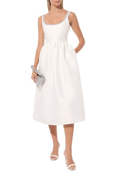 Короткое платье Piripicchio на узких бретелях выполнили из жоржета. Модель вручную декорировали перьями и перламутровыми бусинами.