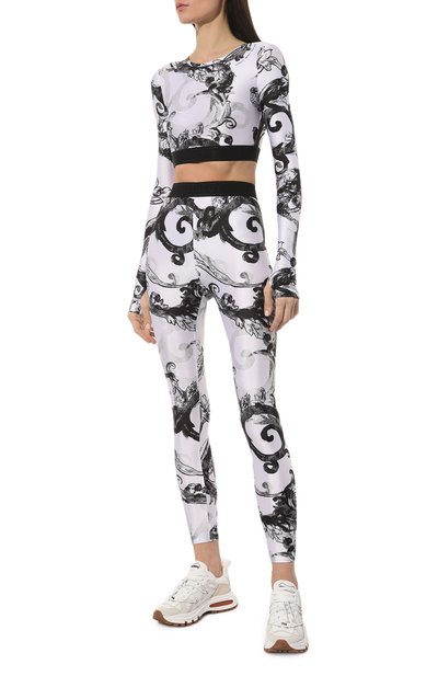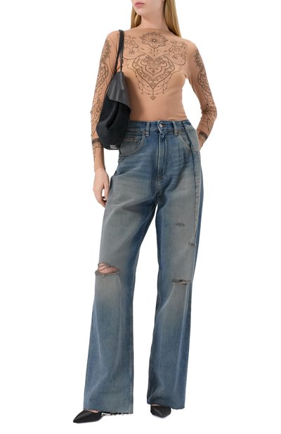 Топ Mostarda с воротником-стойкой выполнили из полупрозрачного эластичного тюля. Модель украсили крупными контрастными принтами, имитирующими татуировки.