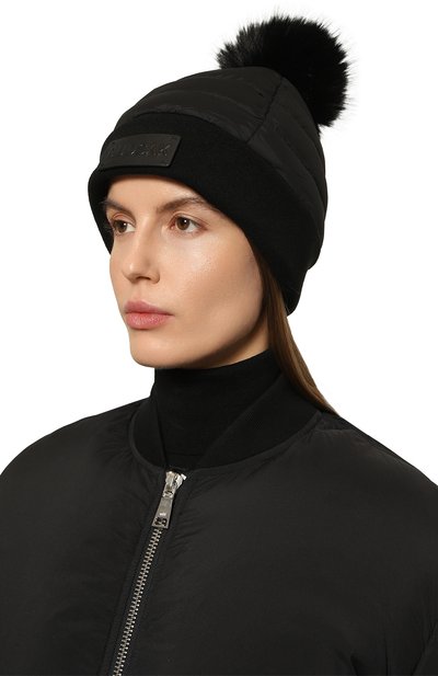 Капор с кулиской, регулируемой тонкими завязками, связали из кардной пряжи на основе шерсти первого пострига. Аксессуар, усыпанный разноразмерными стразами, украсили лентой с жаккардовым логотипом.