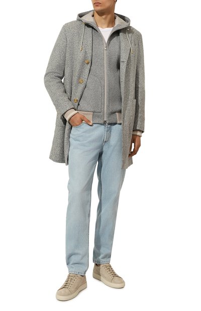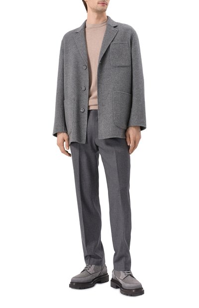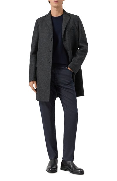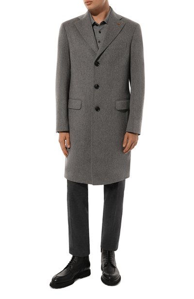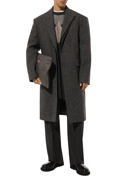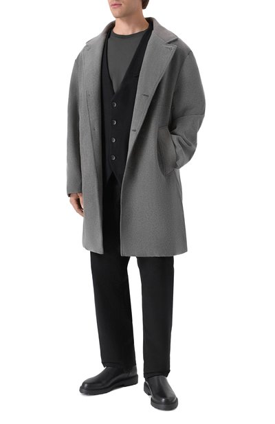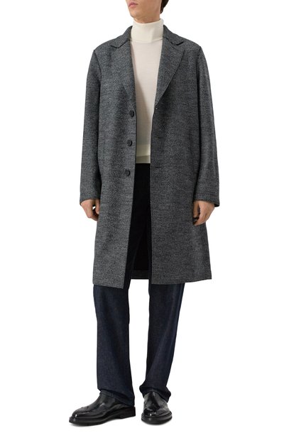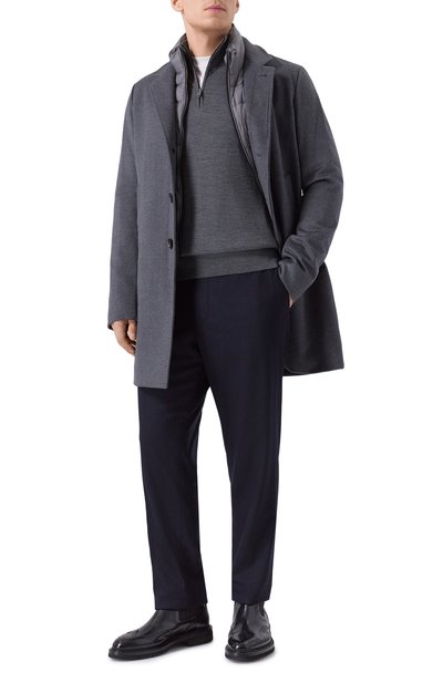 Однобортное пальто со шлицей сзади выполнили из фактурной шерсти с добавлением нейлона. Модель с двумя карманами и фирменной брошью на лацкане дополнили съемной стеганой манишкой с воротником-стойкой.