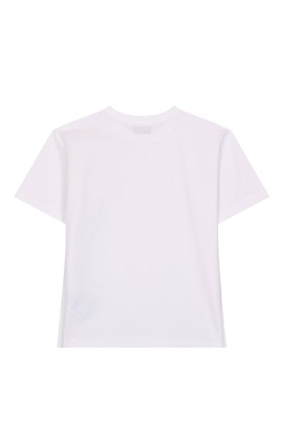 Футболку прямого кроя выполнили из хлопкового джерси. Рукава украсили контрастными полосками, а на плече вручную вышили логотип марки.