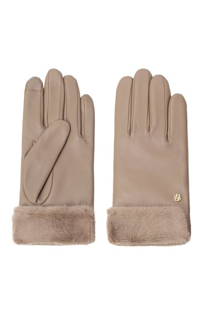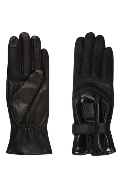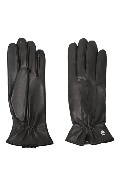 Перчатки с контрастной аппликацией-пистолетом сшили из матовой кожи, а подкладку изделия выполнили из шерсти. Запястье модели дополнили эластичной вставкой.