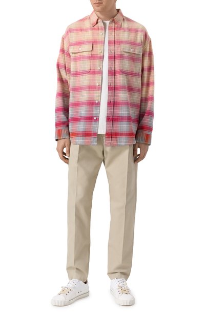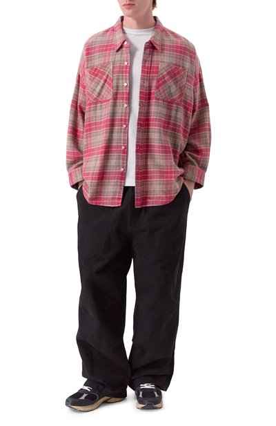 Декоративно состаренную рубашку с рваными краями сшили из хлопковой фланели в клетку. Модель с закругленным подолом и спущенной линией плеч дополнили нагрудным карманом.