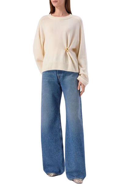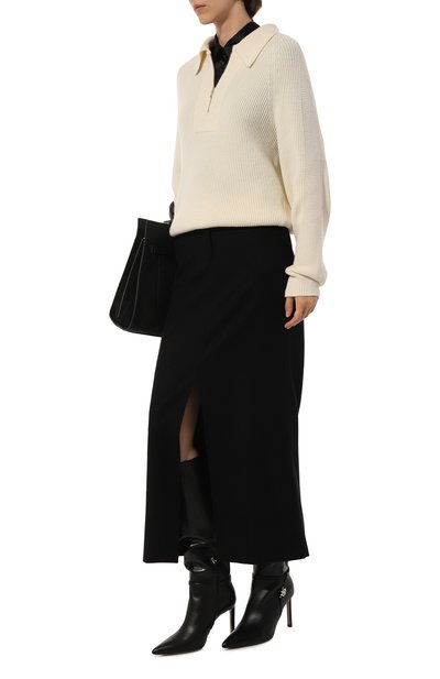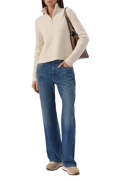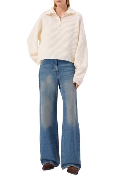 Свитер Dries со спущенной линией плеч выполнили из кашемирового трикотажа. Модель с высоким воротником, манжетами и поясом в рубчик застегивается короткой молнией.