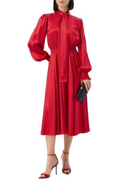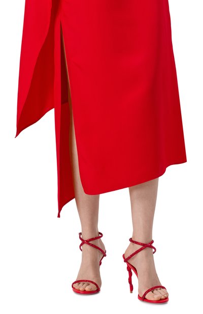 Босоножки Verity с узкой перемычкой, квадратным мысом и короткой молнией на закрытом заднике выполнили из атласа. Ремешок с эластичной вставкой украсили кристальным каскадом.