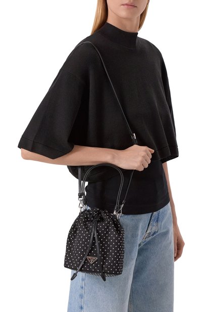 Сумку Re-Edition с узором из заклепок по всей поверхности изготовили из фирменной ткани Re-Nylon. Модель с длинной ручкой и брендированным подкладом украсили знаковым эмалевым треугольником спереди.