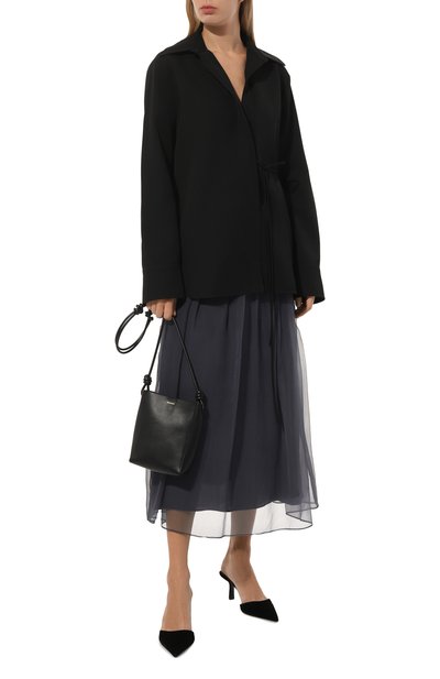 Расклешенную миди-юбку с потайным шнурком на эластичном поясе выполнили из переработанного нейлона Re-Nylon. Спереди изделие украсили фирменной треугольной эмблемой с логотипом марки. Модель дополнили боковыми карманами на молниях.