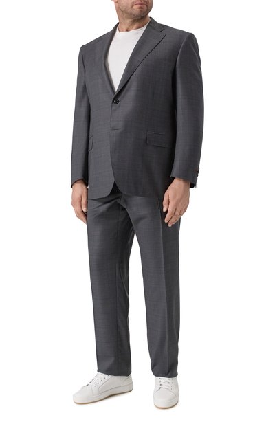 Костюм-двойку выполнили из тонкой шерстяной ткани. Однобортный пиджак с двумя шлицами, прошитый по краям ручной строчкой пунто, дополнили нагрудным карманом и боковыми с клапанами, а брюки прямого кроя – боковыми и задними с пуговицами.