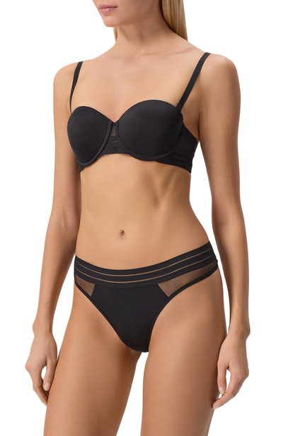 В коллекцию Essential вошли трусы-бразилиана с плоскими эластичным поясом и тщательно проработанными краями. Полупрозрачную модель изготовили из стрейчевого шелка.