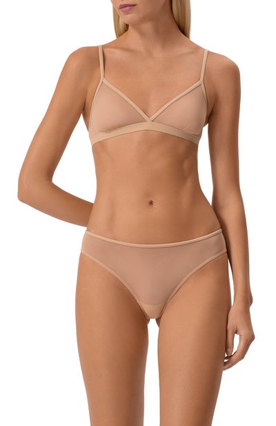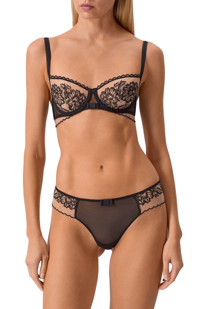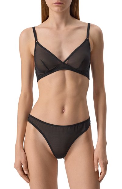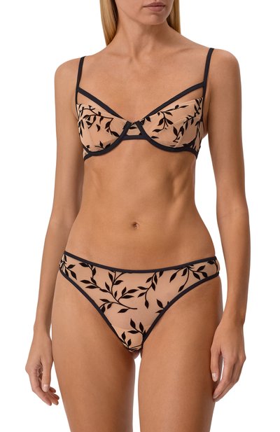 Бюстгальтер-бралетт выполнили из полупрозрачного стрейчевого тюля с флокированным растительным принтом. Модель с треугольными чашечками без косточек и регулируемыми бретелями застегивается двумя потайными крючками с четырьмя вариантами объема.
