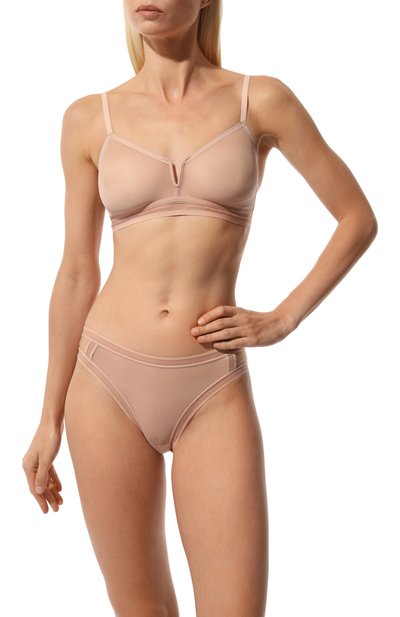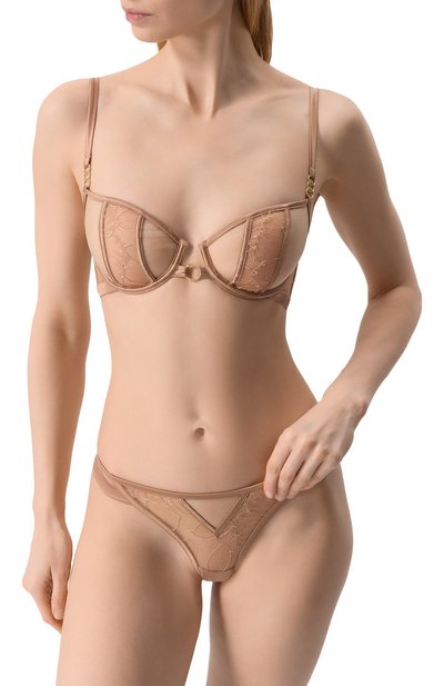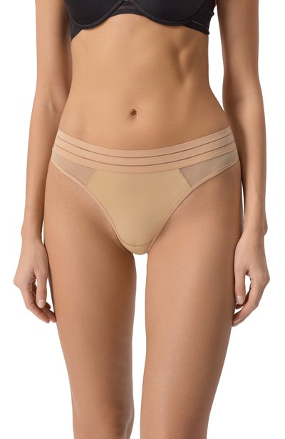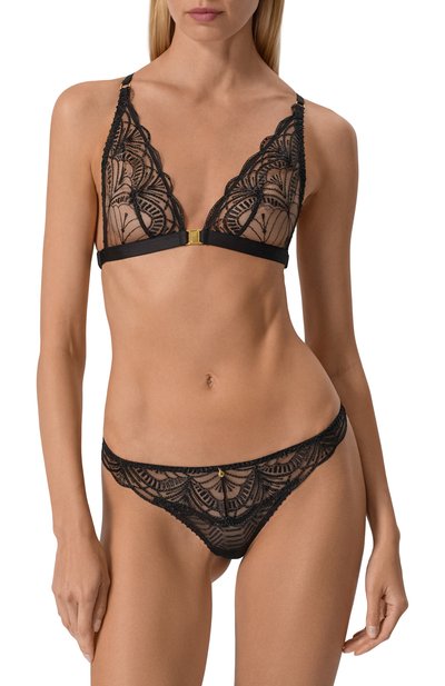 Трусы-стринги изготовле ны из полупрозрачного нейлонового тюля стрейч. Модель украшена контрастным растительным мотивом, в тон которому — узкая кайма по краям.