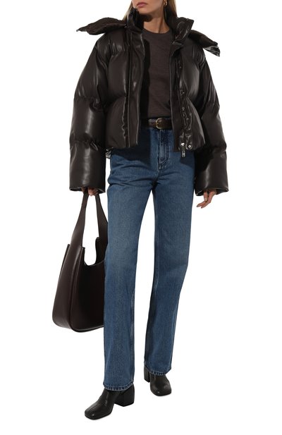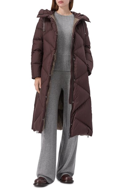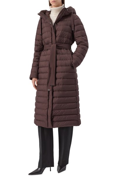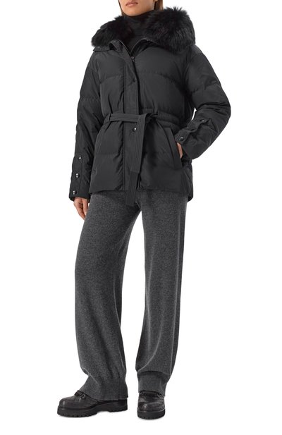 Стеганую куртку на утином пуху выполнили из полиэстера. Пуховик с боковыми карманами и съемным поясом-лентой застегивается потайной молнией и планкой на кнопках. Воротник и входящие в комплект ва режки дополнили отделкой из меха полярной лисицы.