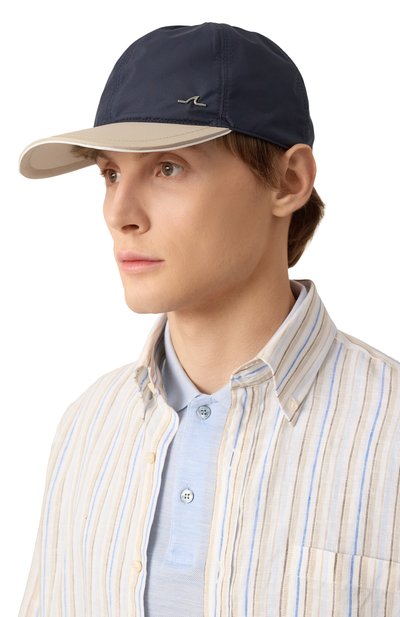 Бейсболку с изогнутым козырьком сшили из нейлона с жаккардовым брендированным паттерном. Аксессуар с металлическим логотипом марки на тулье дополнили хлопковым подкладом и регулируемым ремешком велкро сзади.