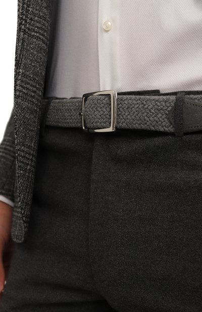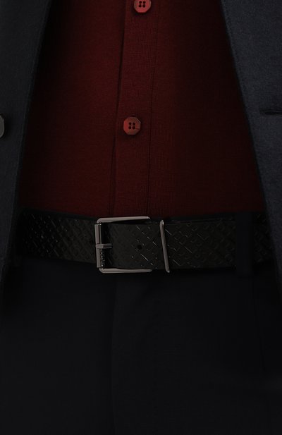 Ремень из бычьей кожи застегивается прямоугольной пряжкой с брендированной шлевкой. Аксессуар можно носить как гладкой стороной наружу, так и изнанкой с микропаттерном.