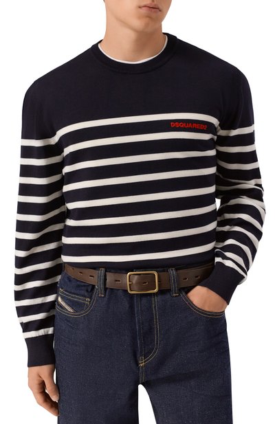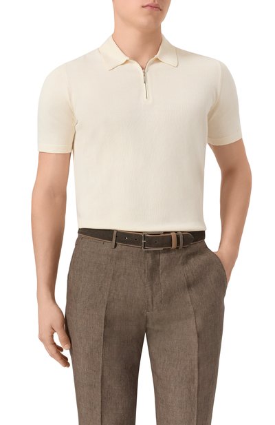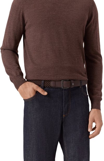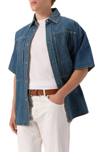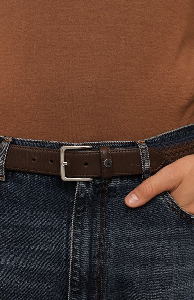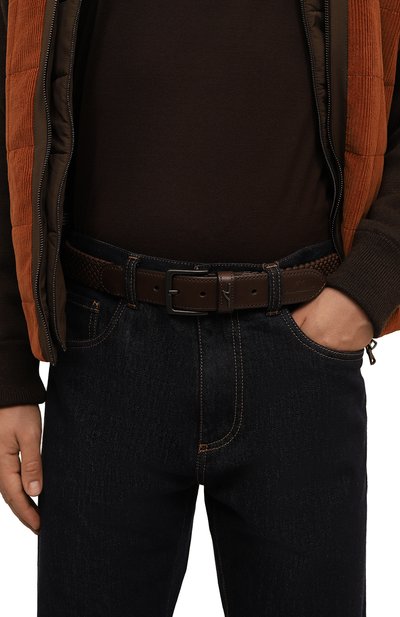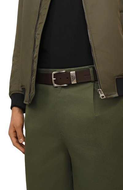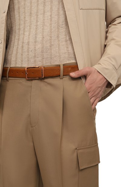 Ремень стандартной ширины выполнили из бархатистой замши. Аксессуар застегивается прямоугольной серебристой пряжкой с выгравированным логотипом на интегрированном тренчике.