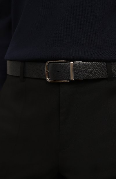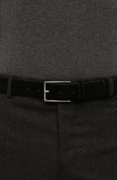Ремень стандартной ширины выполнили из бархатистой замши. Аксессуар застегивается прямоугольной серебристой пряжкой с выгравированным логотипом на интегрированном тренчике.