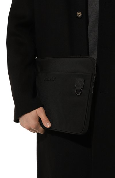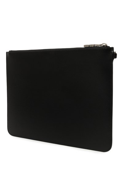 Папку с фирменной накладкой спереди выполнили из зернистой кожи. Аксессуар с двумя отделениями и внешним карточным слотом застегивается молнией.