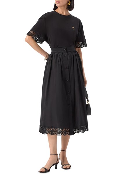Юбку годе выполнили из стрейчевой ткани на основе полиэстера и вискозы. Модель застегивается потайной молнией с пуллером-эмблемой сзади.