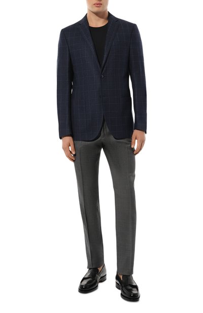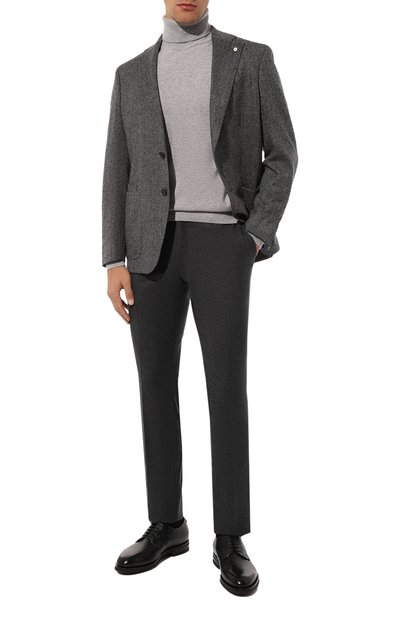 Меланжевые брюки Genius выполнили из шерсти первого пострига. Рядом с одним из четырех карманов модели закрепили брендированную пластину.