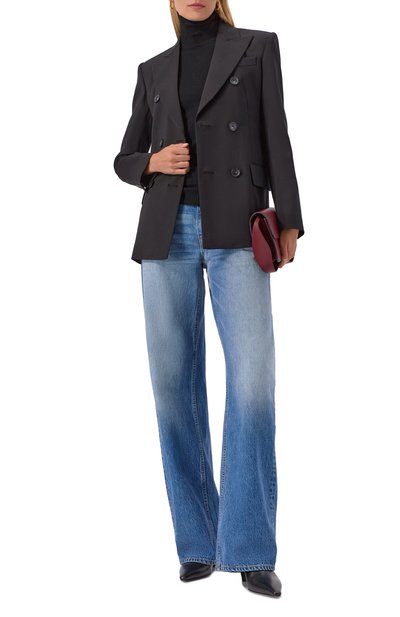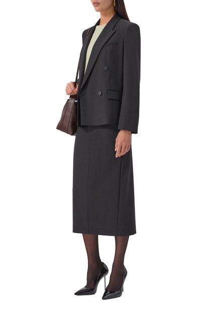 Двубортный жакет со шлицей сшили из эластичной шерсти первого пострига. Приталенную модель с широкими лацканами дополнили боковыми карманами с клапанами.