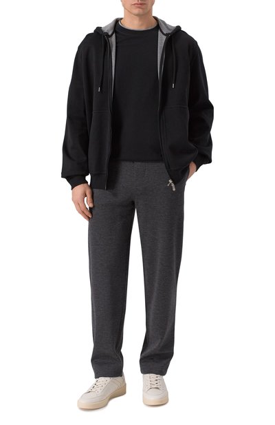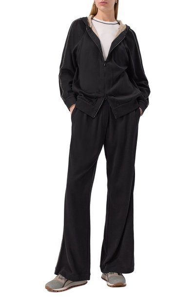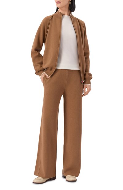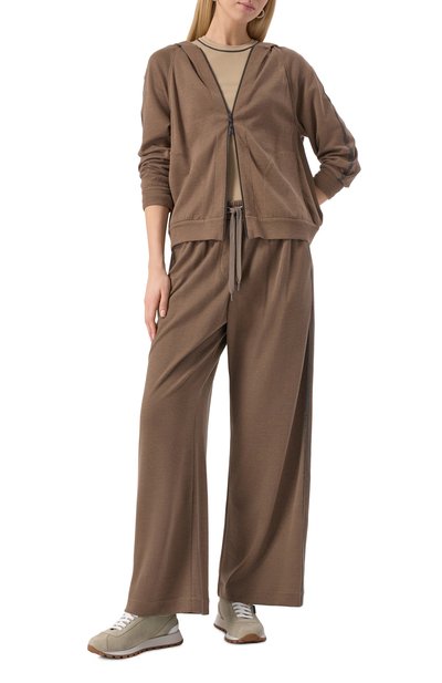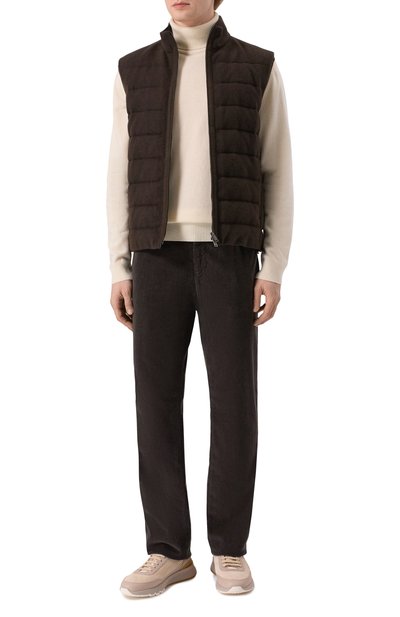 Брюки выполнили из козьей замши, заложив под поясом со шлевками защипы. Модель со средней посадкой дополнили двумя карманами по бокам.