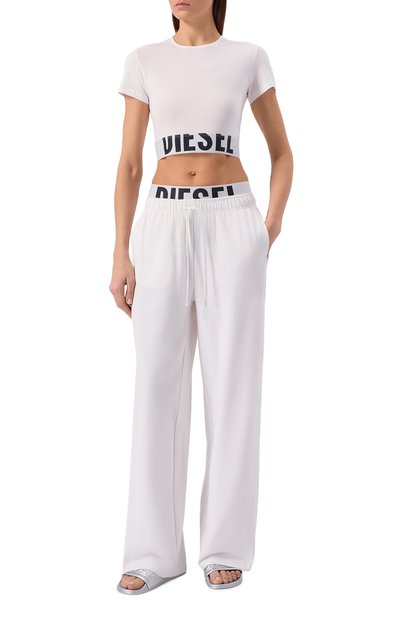 Для изготовления брюк прямого кроя использовали стрейчевый трикотаж на основе модала. За удобную посадку на талии отвечает широкий пояс.