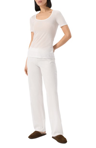 Для создания топа зауженного кроя выбрали джерси на основе модала с добавлением эластана. Проймы и круглую горловину отделали кантом из такого же материала.