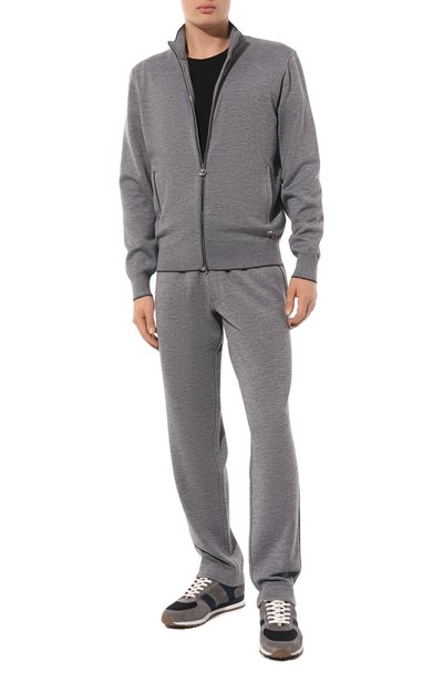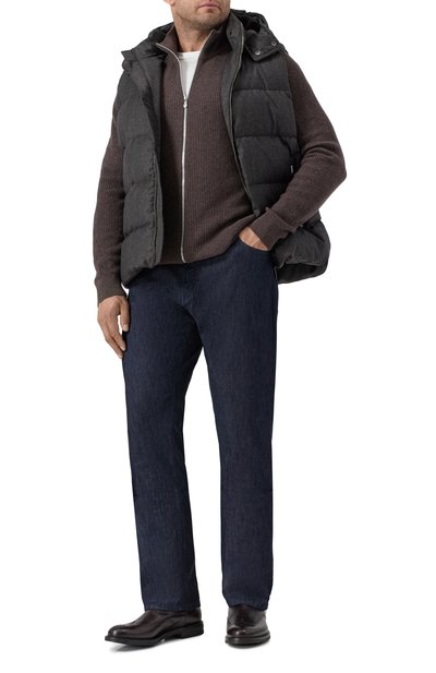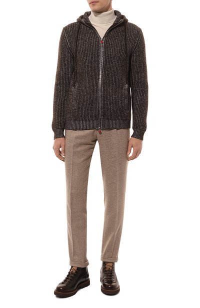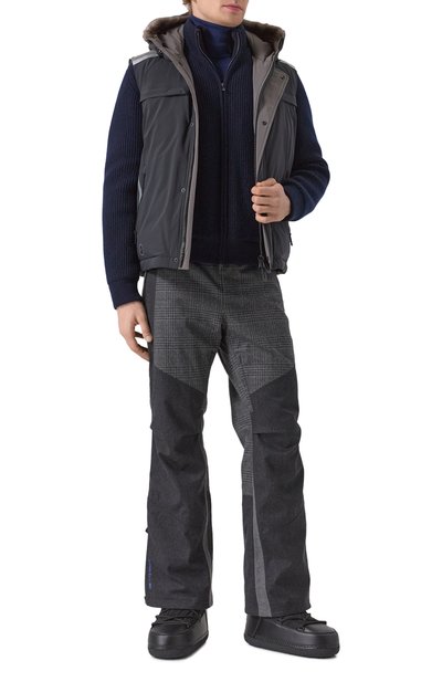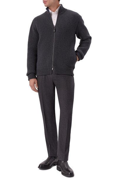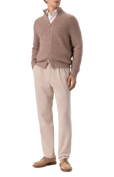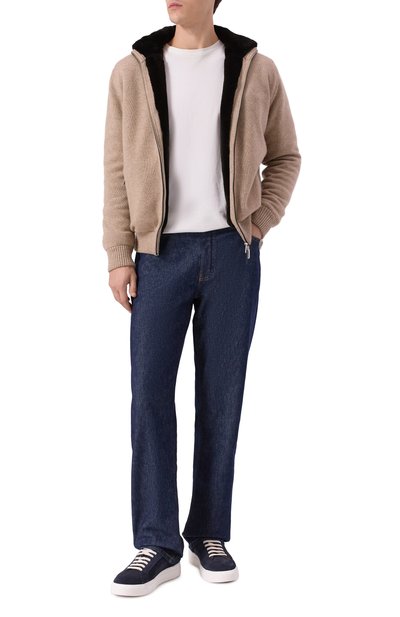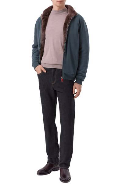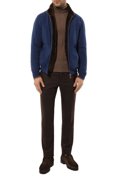 Утепленный кардиган с ребристыми воротником-стойкой, манжетами и поясом выполнили из кашемирового трикотажа, а для изготовления подкладки использовали мех бобра. Модель с двумя боковыми карманами застегивается встречной молнией.