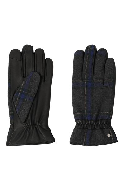 Перчатки сшили из комбинации овечьей кожи и полушерстяной ткани с шевронным узором. Аксессуар с небольшим вырезом на манжете застегивается брендированной кнопкой.