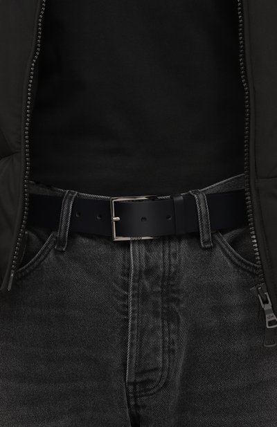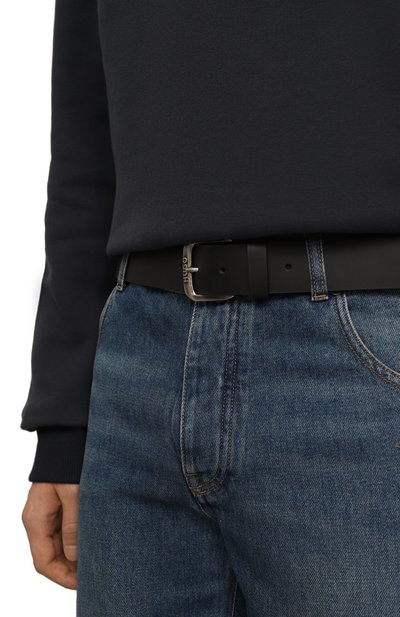 Ремень Gerik стандартной ширины выполнили из зернистой кожи. Пряжку модели украсили выгравированным логотипом бренда, а шлевку подчеркнули строчками фирменного алого оттенка.