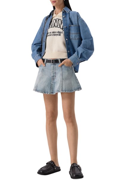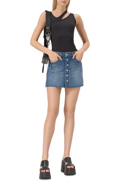 Экстремально короткую джинсовую юбку De-Nora выполнили из потертого хлопкового денима с добавлением пеньки. Модель с пятью карманами застегивается молнией сзади.