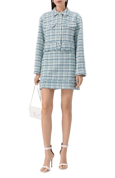 Для пошива клетчатой мини-юбки O-Gracy использовали фактурный смесовый твид. Модель, застегивающуюся потайной молнией сбоку, украсили металлической эмблемой марки.