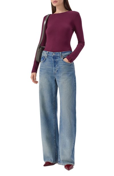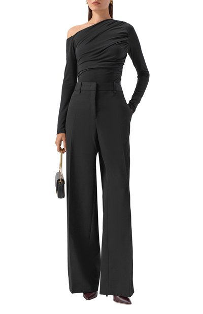 Облегающее боди с овальным вырезом, почти полностью открывающим спину, сшили из вискозного джерси стрейч. Левый рукав подчеркнули небольшим брендированным ярлыком, а снизу предусмотрели потайную застежку.