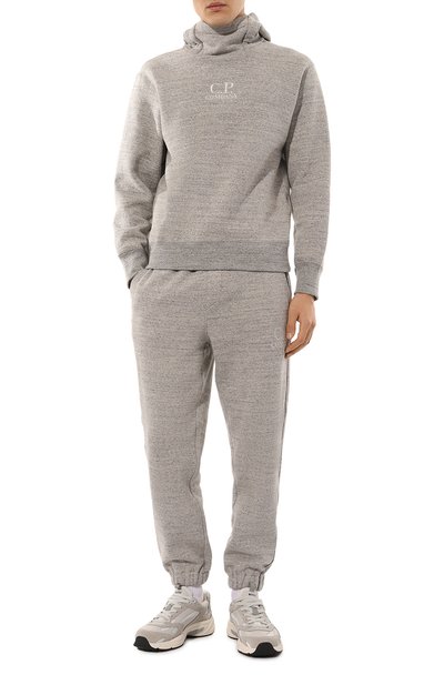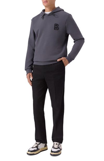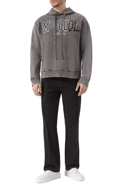 Худи со спущенной линией плеч и карманом «кенгуру» изготовили из хлопкового трикотажа с флисовой изнанкой. Рукава модели украсили контрастными накладками, а капюшон – брендированной нашивкой.