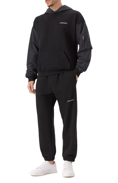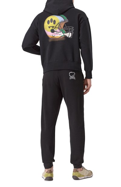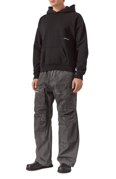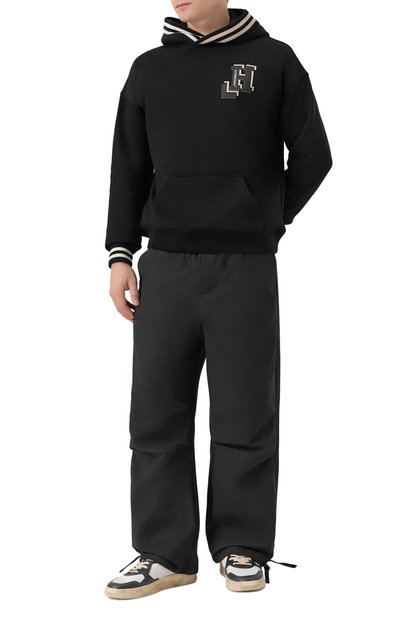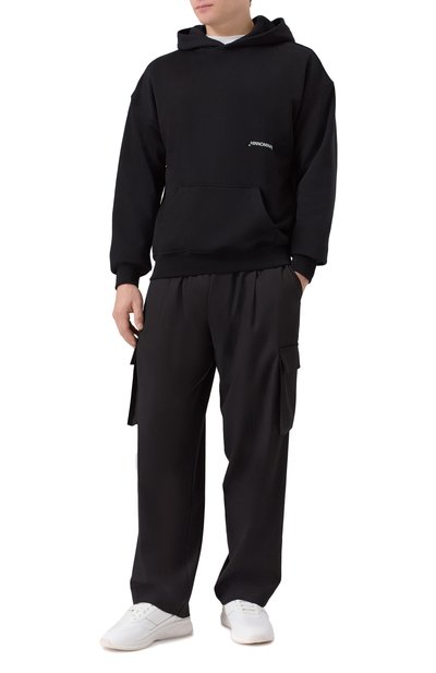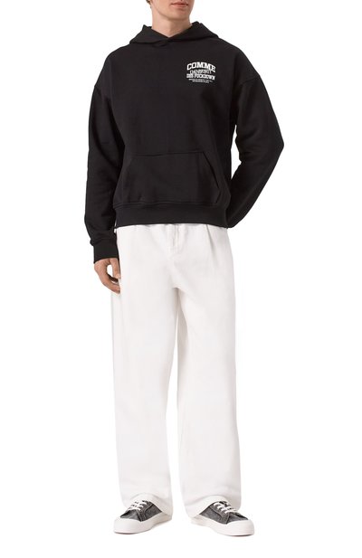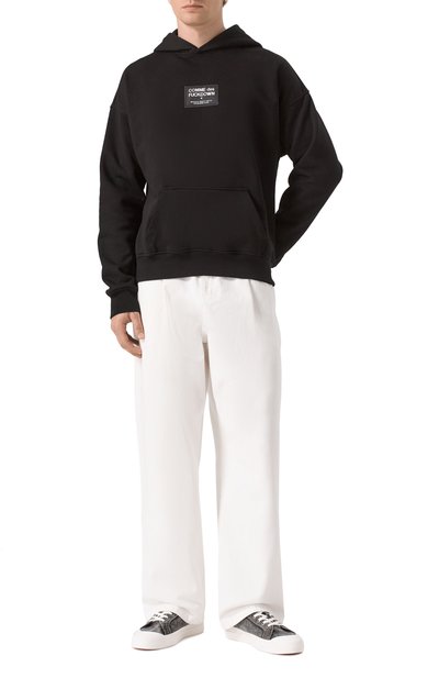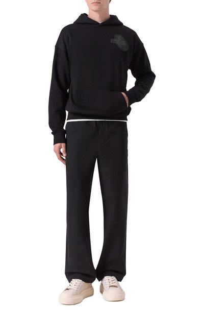 Худи с карманом «кенгуру» выполнили из хлопка с добавлением полиэстера. Принадлежность модели бренду обозначили при помощи фирменного логотипа, вышитого спереди.