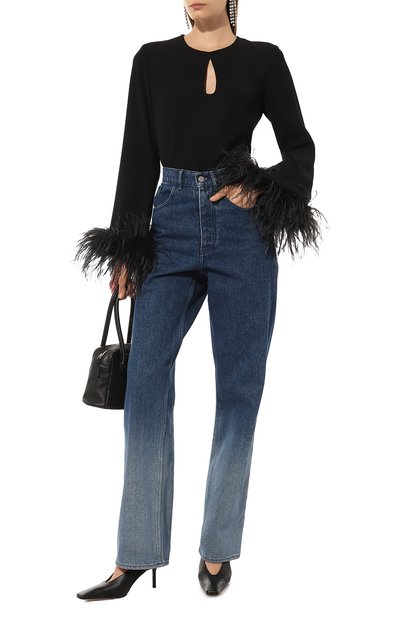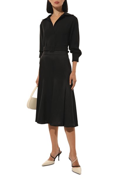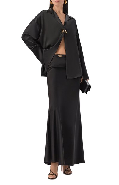 Блузку, напоминающую кейп, выполнили из стрейчевого блестящего атласа на основе ацетата. Модель с глубоким V-образным вырезом застегивается брендированными пуговицами-тоглами.