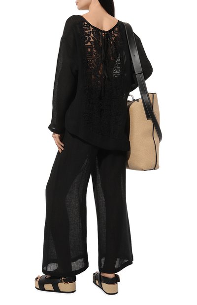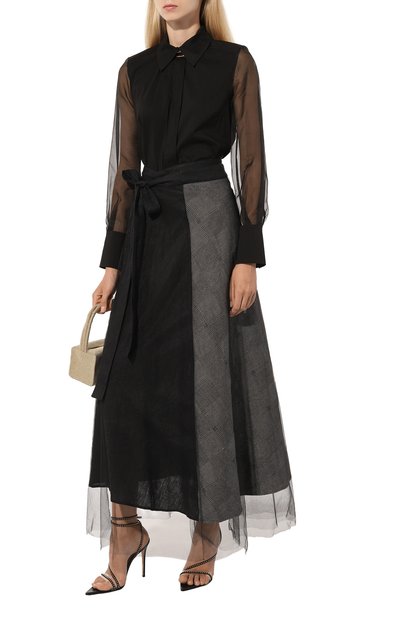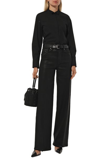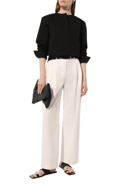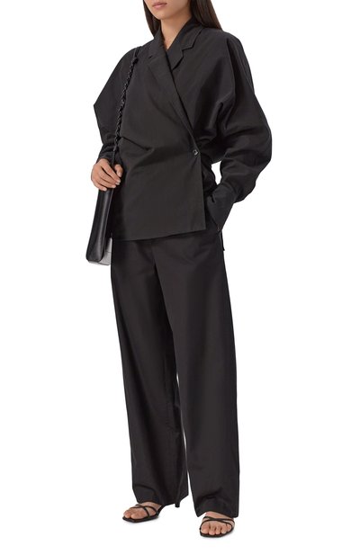 Блузку, напоминающую кейп, выполнили из стрейчевого блестящего атласа на основе ацетата. Модель с глубоким V-образным вырезом застегивается брендированными пуговицами-тоглами.