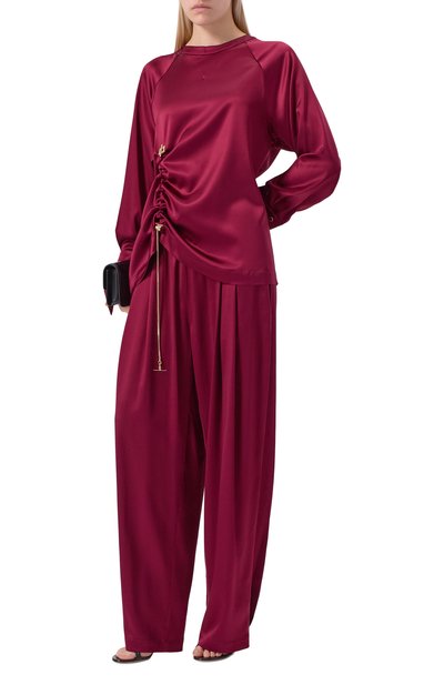 Макси-юбку из эластичного атласа дополнили золотистой цепочкой с брендированными Т-образными креплениями и фиксатором. Модель застегивается потайной молнией сбоку.