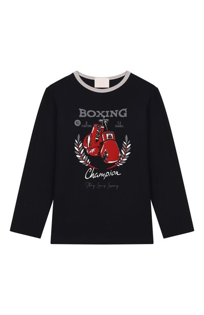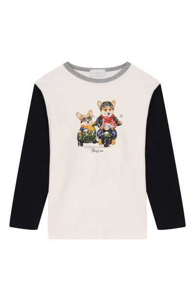 Для изготовления пижамы использовали хлопковой трикотаж. Лонгслив с круглой горловиной и отделкой в рубчик украсили контрастным логотипом. Ему вторит фирменный паттерн на эластичном поясе брюк.